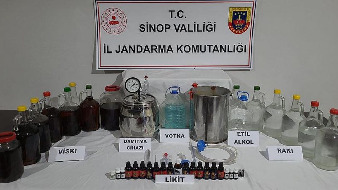 Edinilen bilgiye göre, Sinop İl Jandarma Komutanlığı ekiplerince ‘bağımlılıkla mücadele’ çalışmaları çerçevesinde Durağan ilçesinde yapılan istihbari çalışmalarda, kaçak alkol üretimi yaptığı tespit edilen bir kişinin evinin bahçesindeki barakaya baskın düzenlendi. Yapılan incelemelerde şişeler içerisinde hazırlanmış 36 litre viski, 22 litre rakı, 4,5 litre votka olmak üzere toplam 62,5 litre ev yapımı alkol piyasaya sürülmeden ele geçirildi. Ayrıca odalarda 1 litre etil alkol, likit aroma, anason yağı ve damıtma aleti de ele geçirildi.