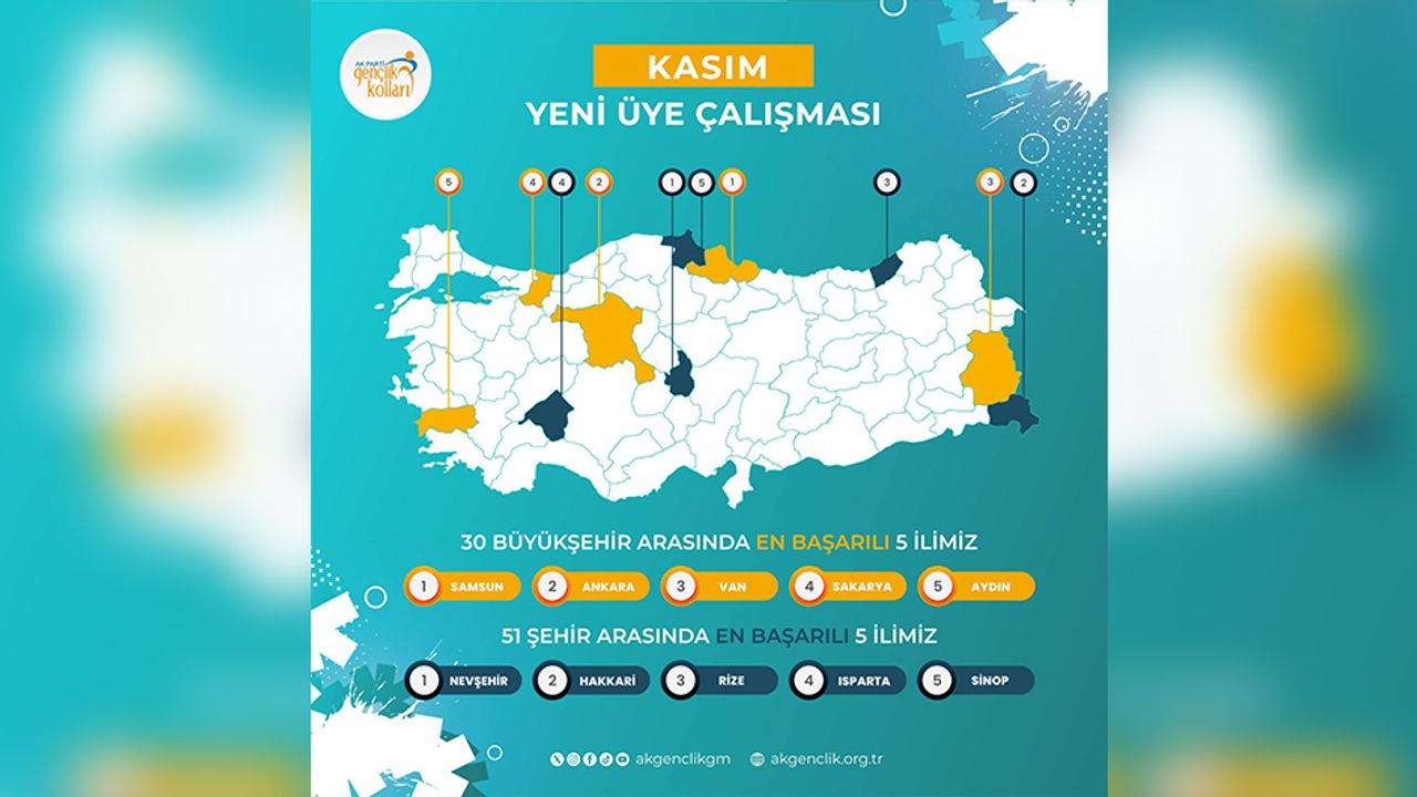 Açıklanan rapora göre, en çok yeni üye kaydı yapan iller sıralamasında ilk 5 şu şekilde belirlendi: Listenin zirvesinde Nevşehir yer alırken, Hakkari ikinci, Rize üçüncü ve Isparta dördüncü oldu. Sinop İl Gençlik Kolları ise bu güçlü illerin hemen ardından gelerek beşinci sıraya yerleşti.