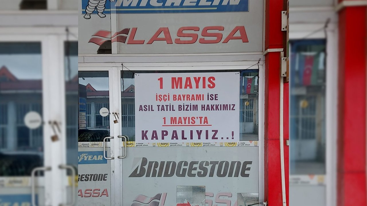 Sinop’ta faaliyet gösteren bir lastikçi, 1 Mayıs Emek ve Dayanışma Günü’nde kapalı olacağını iş yerinin kapısına astığı yazıyla duyurdu.