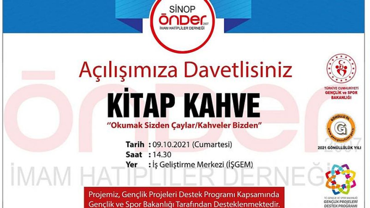 Sinop Önder İmam Hatipliler Derneği tarafından 9 Ekim Cumartesi günü saat 14:30’da İş Geliştirme Merkezi(İŞGEM)’nde Gençlik ve Spor Bakanlığı tarafından desteklenen “Kitap Kahve” açılışı gerçekleşecek.