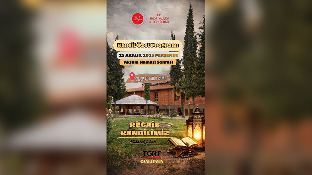 Sinop’ta Regaib Kandili özel programı, TGRT EU, TGRT Haber ve TGRT Belgesel kanallarından eş zamanlı olarak canlı yayınlanacak. T.C. Sinop Valiliği İl Müftülüğü koordinasyonunda hazırlanan program, 25 Aralık Perşembe günü akşam namazının ardından Sinop Alaaddin Camii’nde gerçekleştirilecek.