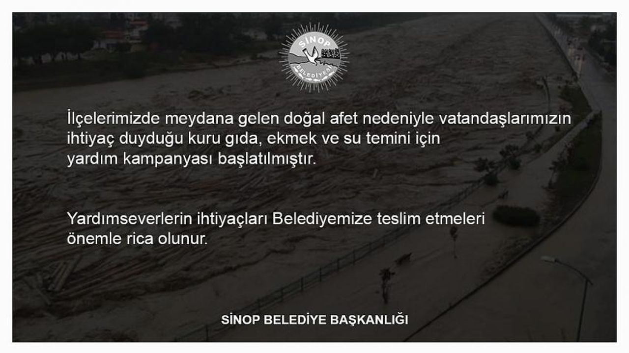 Sinop Belediyesi sosyal medya hesaplarından yardım kampanyası ile ilgili yapılan paylaşımlarda şu ifadelere yer verildi :”İlçelerimizde meydana gelen doğal afet nedeniyle vatandaşlarımızın ihtiyaç duyduğu kuru gıda, ekmek ve su temini için yardım kampanyası başlatılmıştır. Yardımseverlerin ihtiyaçları Belediyemize teslim etmeleri önemle rica olunur.”