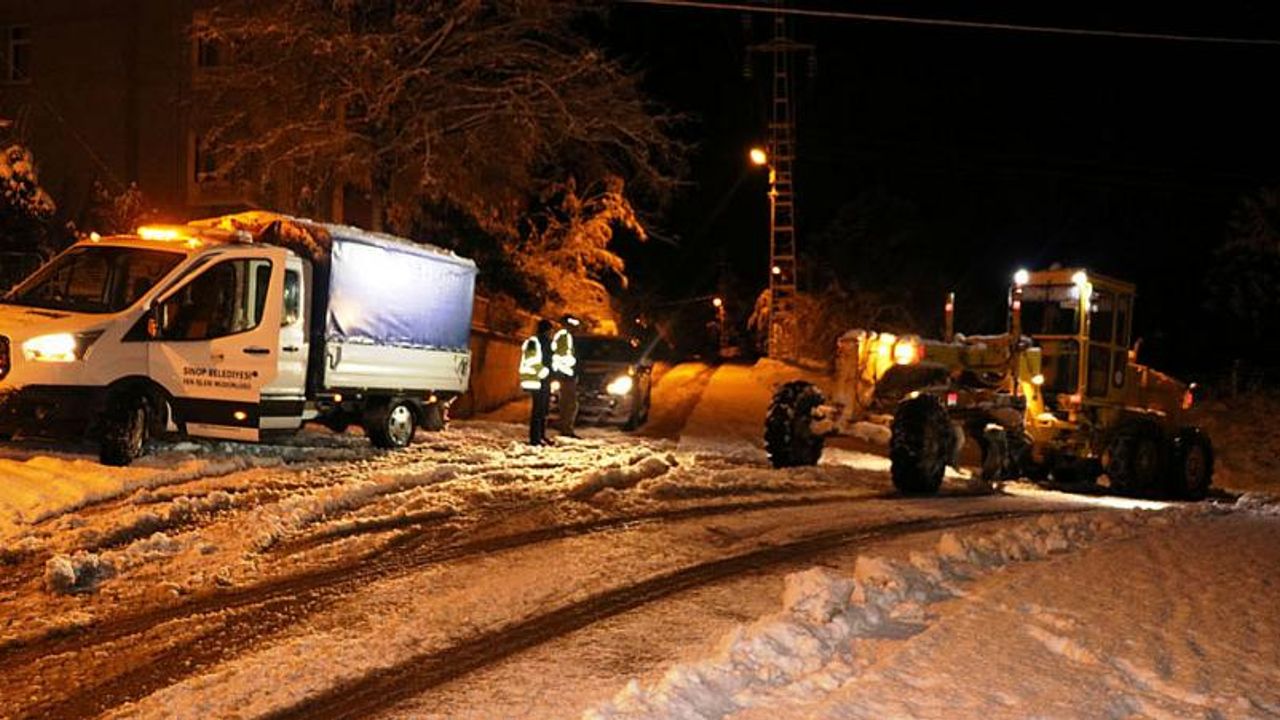 Sinop Belediyesi ekipleri şehirde etkili olan kar yağına karşı teyakkuza geçti. Ekipler karın etkisini arttırmaya başladığı andan itibaren mesai mefhumu gözetmeden çalışmalarını sürdürüyor.