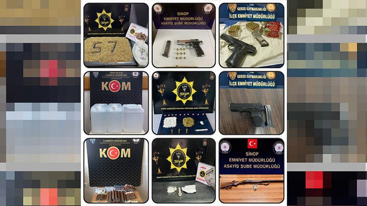 Sinop İl Emniyet Müdürlüğü personelleri tarafından 3 Mart ile 2 Nisan tarihleri arasında genel güvenlik ve asayişin temini açısından yürütülen şok uygulamaların raporu yayımlandı. Rapora göre 1 ayda yapılan asayiş kontrollerinde 42 aranan şahıs yakalandı, 15 kişi tutuklandı, 7 adet ruhsatsız tabanca ile 58 adet fişek ele geçirildi. Bunun dışında 134,29 gram S.Kannabinoid (Bonzai), 25,36 gram metamfetamin maddesi, 16 Adet Sentetik Ecza 3,12 gram Esrar, 1,21 gram Toz Ecstasy, 181 adet puro, 15 Litre Etil Alkol, 69 adet mermi, 6 adet Av Tüfeği, 58 adet fişek ve 1.330 Türk Lirası suç geliri para ele geçirildi.