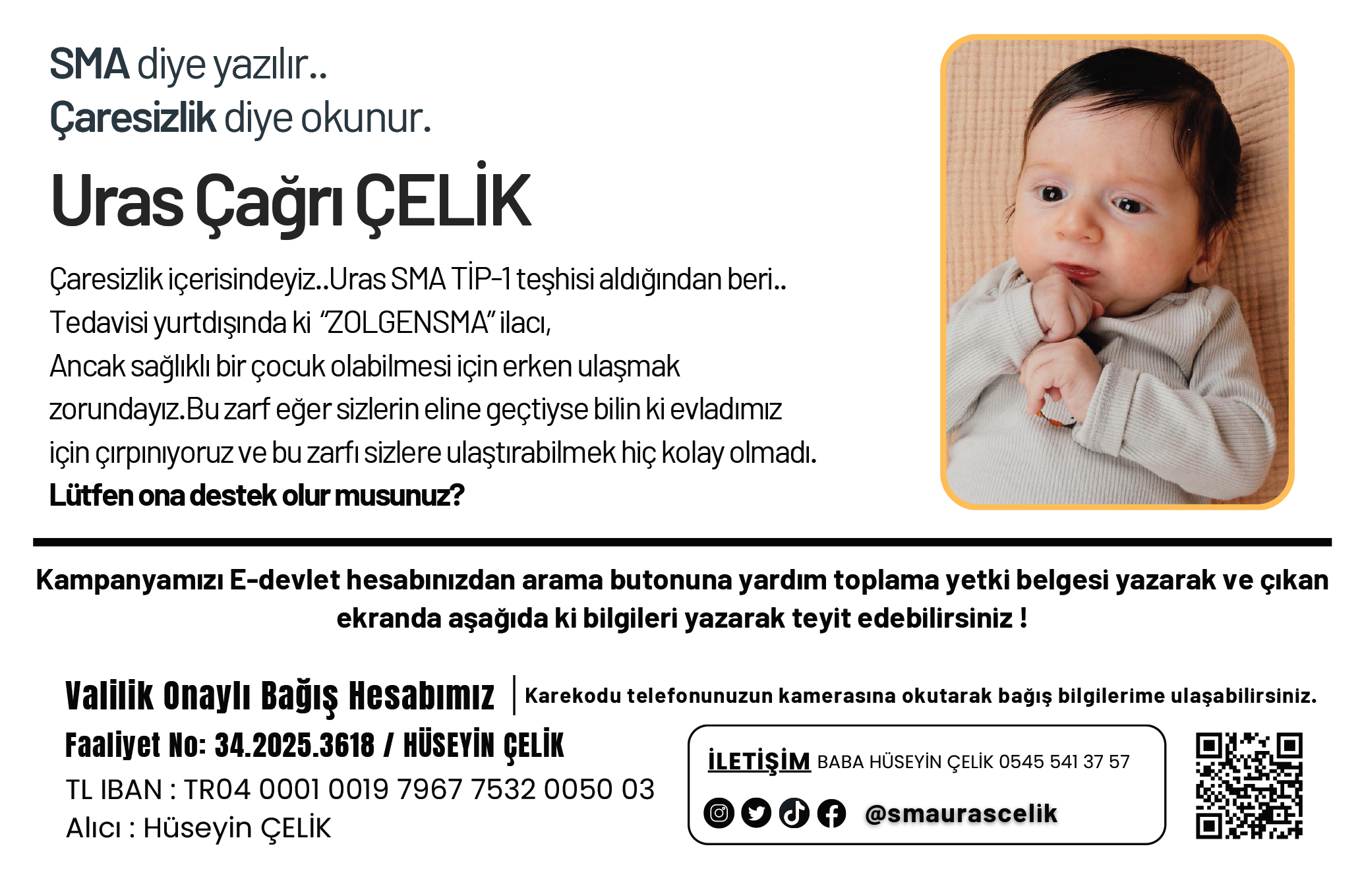 Uras Çağrı Çelik’in babası Hüseyin Çelik ise; “Oğlum 14 günlükken SMA tipi kas hastalığı tanısı koyuldu. Geçtiğimiz ayın 7’sinde 4’ncü dozumuzu aldık. Gerçekten aile olarak zor durumdayız. Gerçekten çok kişinin az parasına ihtiyacımız var. Lütfen bağışlarınızı oğlumdan esirgemeyin. Oğlum sizler sayesinde yürüyebilir, top oynayabilir. Sizlerin kıymetli desteklerini istiyoruz. Hepinize teşekkür ediyorum” diye konuştu.