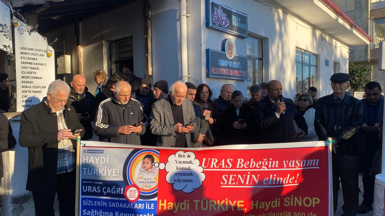 SMA Tip-1 hastası Sinoplu Uras Çağrı bebek için Sinop Gazeteciler Cemiyeti önünde basın toplantısı düzenlendi. Basın toplantısına Sinop Belediye Başkanı Metin Gürbüz, SMA Tip-1 hastası Sinoplu Uras Çağrı bebeğin babası Hüseyin Çelik, STK Temsilcileri ve vatandaşlar katıldı. Basın toplantısında konuşan Sinop Belediye Başkanı Metin Gürbüz, toplantıya katılan vatandaşlardan telefonlarından SMS atmasını istedi.